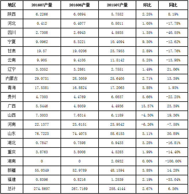 卓创统计数据,2016年7月全国电解铝冶炼企业总产量274.8607万吨,较2016年6月份增长7.1488万吨,涨幅2.67%,较去年同期增